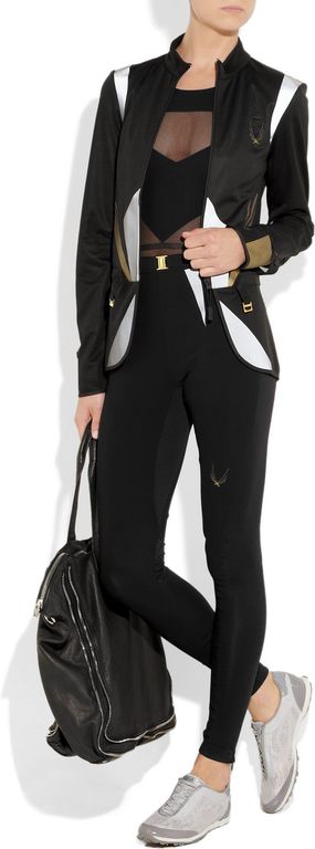 . Silver and gold stripes, high-visibility panels, headphone eyelet at chest, gold embroidered motif, breathable mesh panels under arms, elbow patches, zip-fastening slit pocket, belt straps, pleated back hem